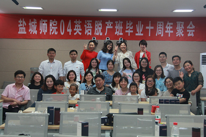 [成教网讯]适逢盐城师范学院60周年校庆之际,2018年4月30日,继续教育学院2004级英语脱产班20多名校友在通榆校区南园2号楼201教室聚首一堂,庆祝毕业十周年。